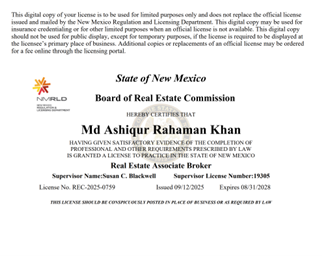 Ashique Khan is a newly licensed Realtor® proudly serving Albuquerque, Rio Rancho, and the surrounding areas. With a strong background in engineering, Ashique brings a detail-oriented and analytical approach to every real estate transaction. He is dedicated to delivering exceptional client satisfaction by offering personalized services tailored to each client’s unique goals and needs. Always staying informed about the latest trends in the housing market, Ashique is passionate about helping others achieve their real estate dreams—while continuously exploring new opportunities for investment and growth in the industry